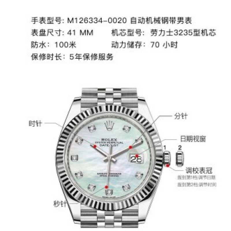 Swiss Rolex Watch Datejust 41 Series Automatic Mechanical Men's Watch M126334-0020 White Pearl with Diamond Five-Grid Chain TL65426.1 |
