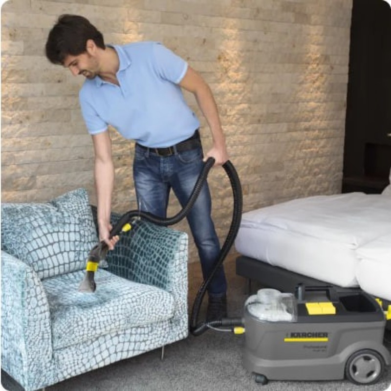 Dengan tekanan semburan 1 bar, mesin ini memastikan pembersihan tekstil yang lembut dan mendalam serta memberikan hasil yang mengagumkan, terutamanya untuk permaidani dan upholsteri. Muncung lantai yang sempit membolehkan pembersihan di ruang sempit, manakala bibir sedutan fleksibel memudahkan pembersihan di kawasan berhalangan. Mesin ini juga dilengkapi dengan penyimpanan aksesori terintegrasi serta bekas air bersih dan kotor 2-dalam-1 yang boleh ditanggalkan.