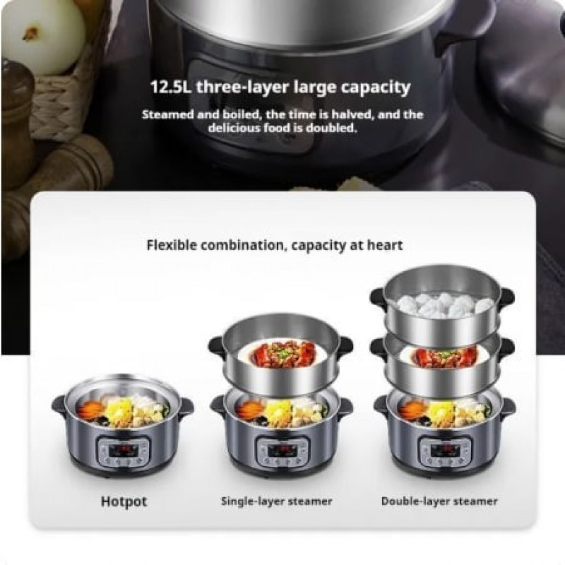 (Palam Malaysia) Pengukus Elektrik Midea Tiga Lapisan 12L Kapasiti Besar Pelbagai Fungsi Periuk Keluli Tahan Karat Kawalan Masa Memasak Makanan Kukus