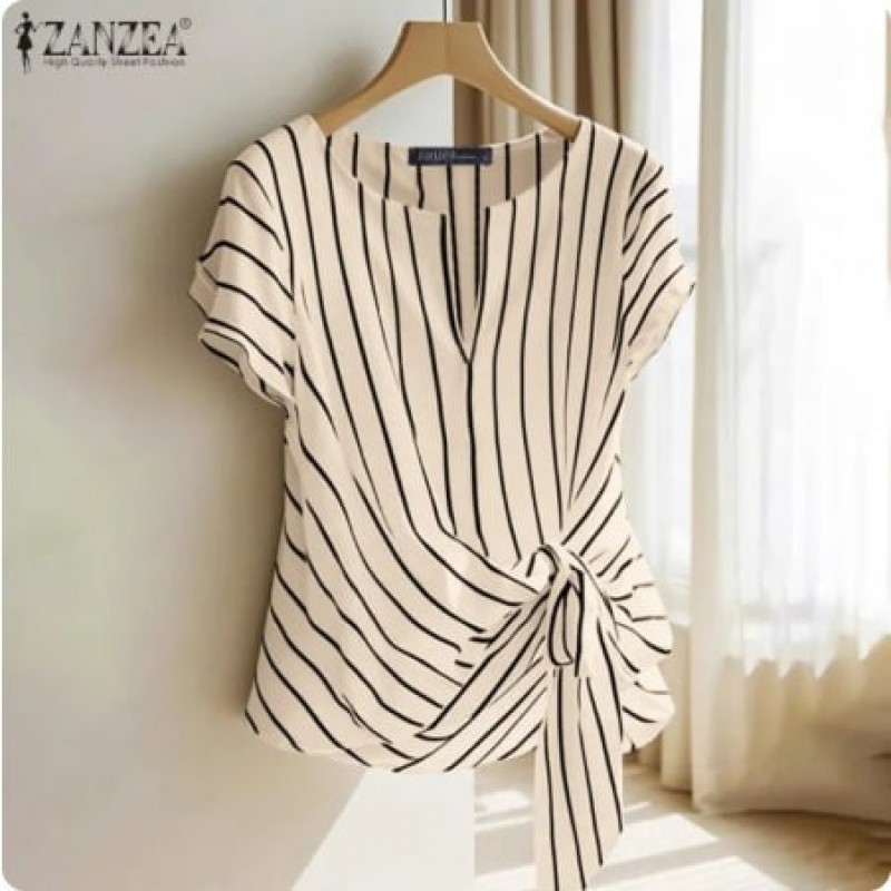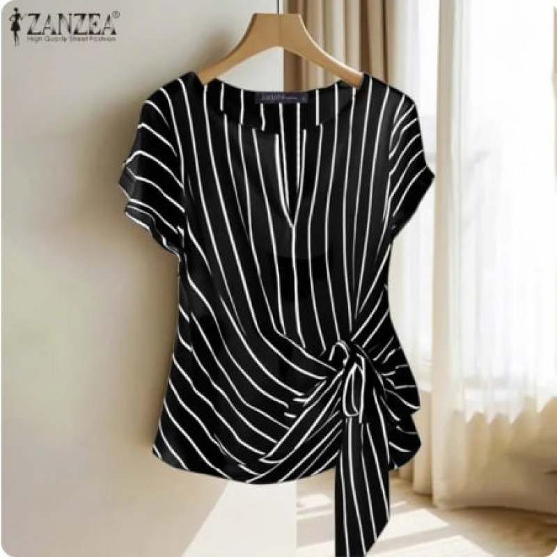 ZANZEA wanita pejabat v-neck Raglan lengan blaus Stripe cetak Knotted Work Thin Top #0421