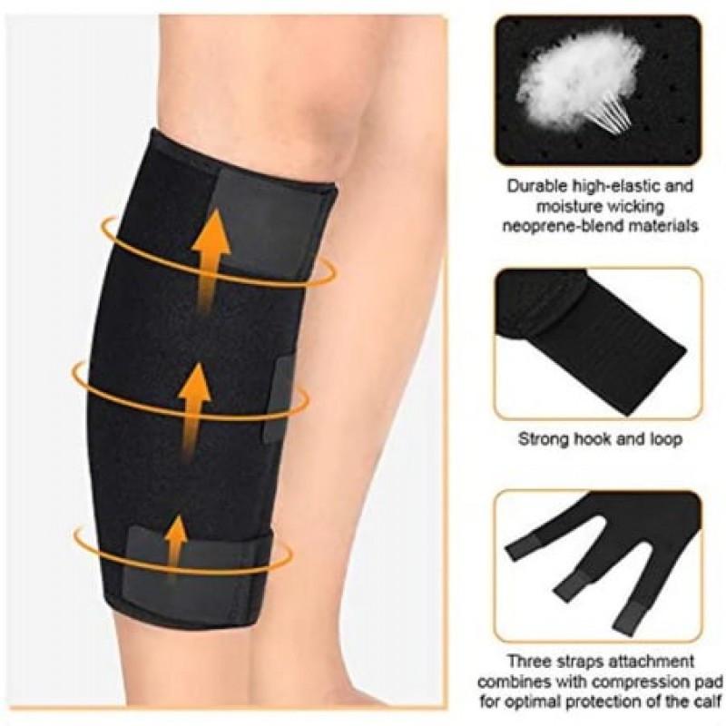 Product Description The Calf Support is a versatile compression wrap designed to provide support to the calf and shin. It is made with a lightweight neoprene fabric that is perfect for exercising, and secures in place with three extra-strength latching straps. Ideal for injuries and sprains of the calf or shin muscles.Wear to warm muscles before strenuous activities or all day for constant, adjustable compression.Soft neoprene blend retains body heat for increased circulation to relieve pain.