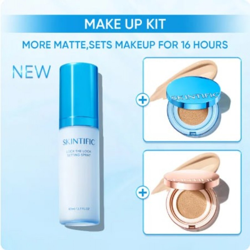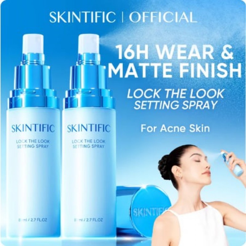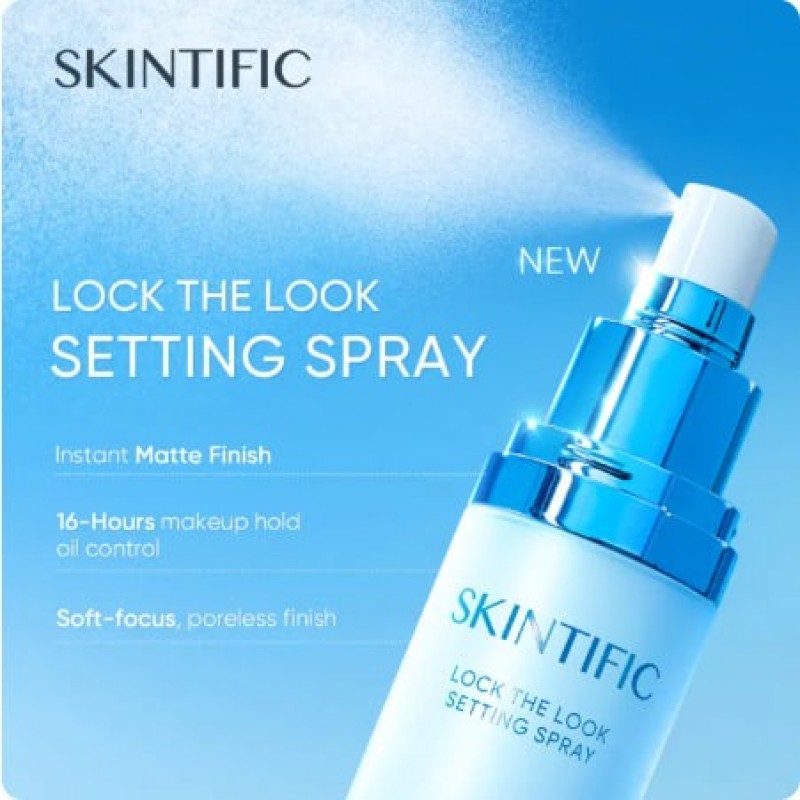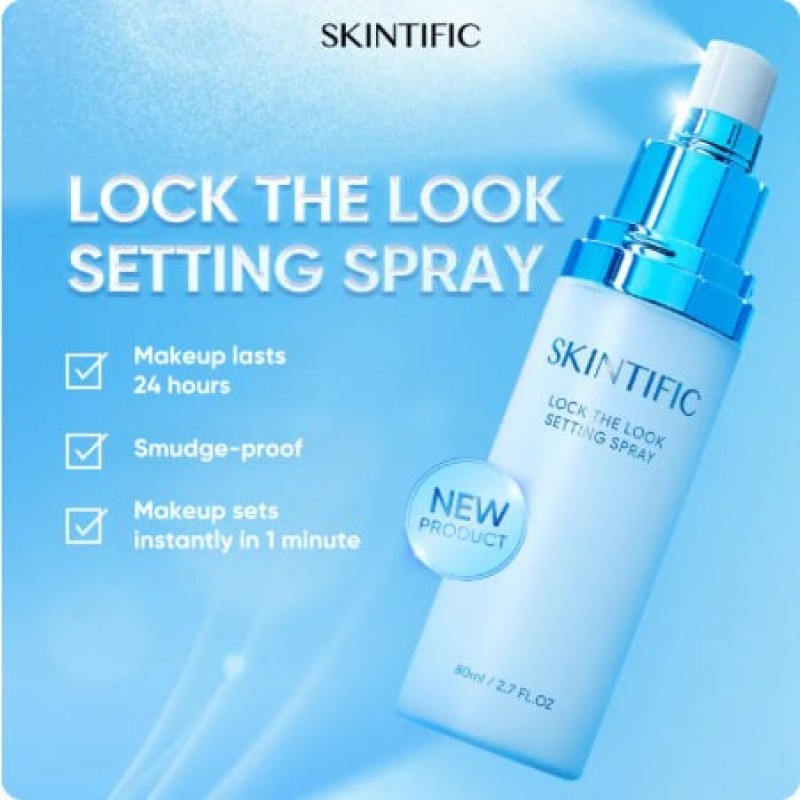SKINTIFIC Lock The Look Setting Spray 80ML Setting makeup 16 hours long. Giving a soft matte, poreless finish. Protecting skin from Blue light, pollution, and maintains skin hydration with a refreshing cooling sensation. Formulated for all skin types. Hero Ingredients: Ferulic acid: antioxidant which prevents dullness Hyaluronic acid: hydrates and maintains skin moisture level Ectoin: protection against blue light, UVA/UVB, and environmental stressors. How to use: 1. After completing makeup look, SHAKE THE BOTTLE WELL. 2. Close eyes firmly, hold the bottle 20-25 cm from face and mist evenly all over. 3. Allow formula to dry before opening eyes.